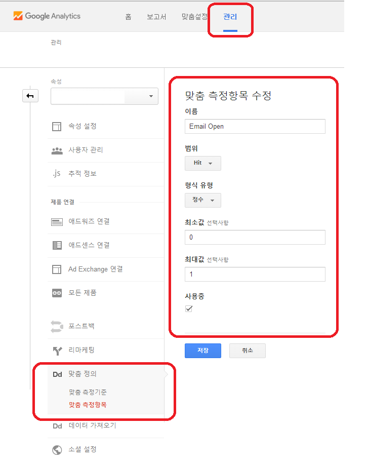 구글 애널리틱스에 로그인 후, 관리 > 속성 >맞춤정의 > 맞춤 측정항목 > 새맞춤 측정항목 을 클릭한 후 아래 그림과 같이 설정한다.