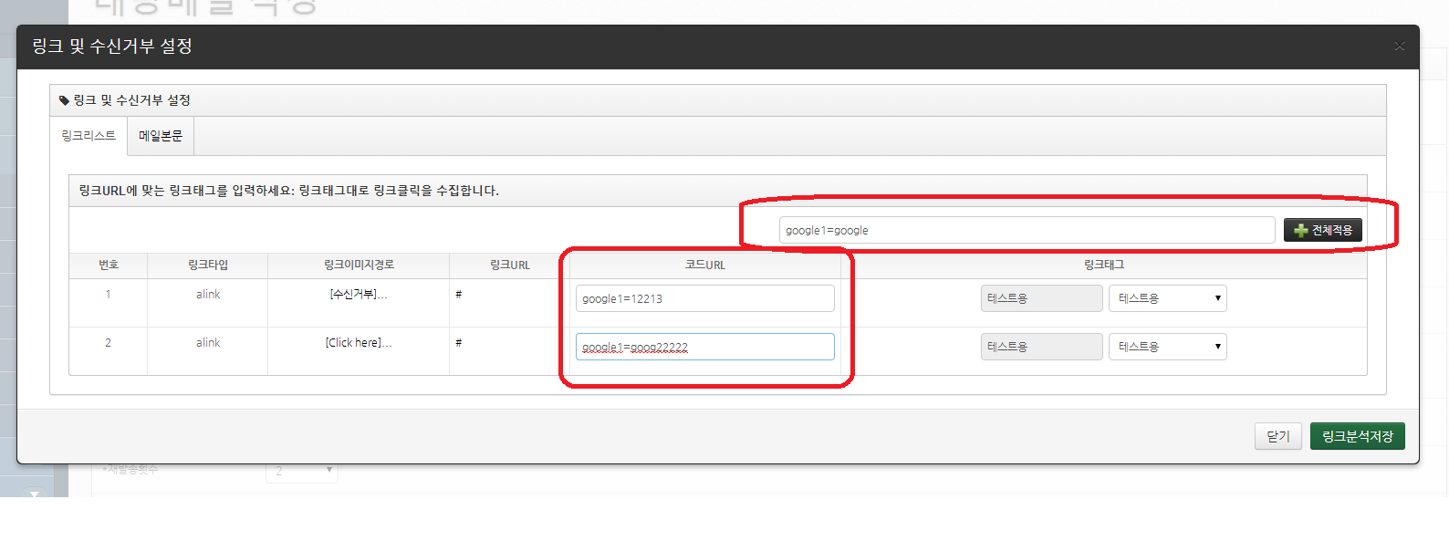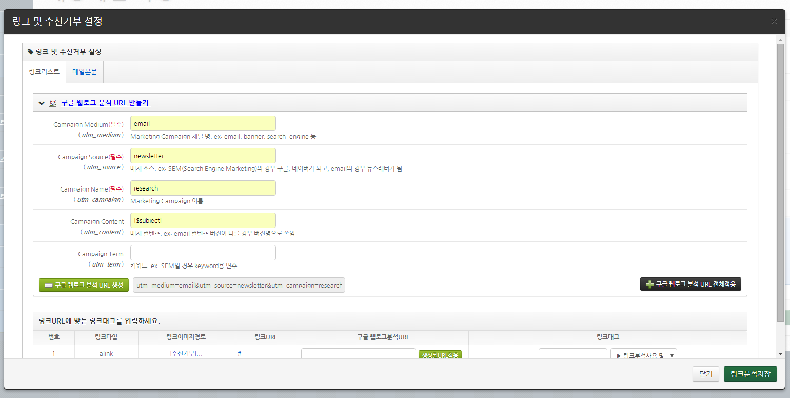 구글 분석 캠페인 항목을 작성하고 캠페인 URL을 생성한다. 생성한 캠페인 URL을 대량메일 작성시 이메일 템플릿 내 링크에 구글분석 파라미터를 간단하게 삽입한다. 캠페이 URL 삽입시 각각 다른 URL을 삽입하는 경우 일괄 적용후 수정이 필요하다.