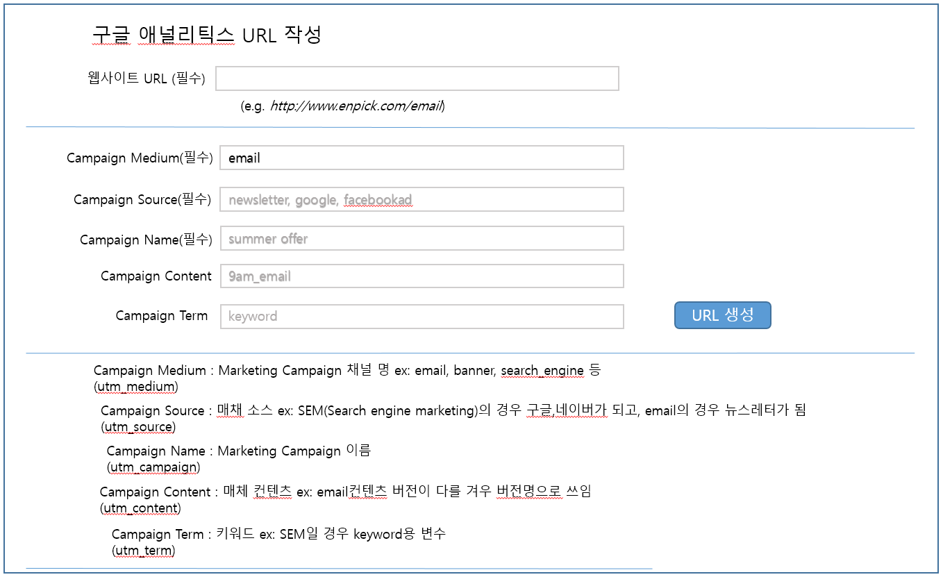 구글 분석의 자세한 목표설정이나 특정 배너나 링크에서 유입된 고객이 어떤 행동을 하고 설정된 목표대로 전환이 이루어지는 분석하기 위해서는 특정 파라미터를 삽입 후 추적해야 한다.