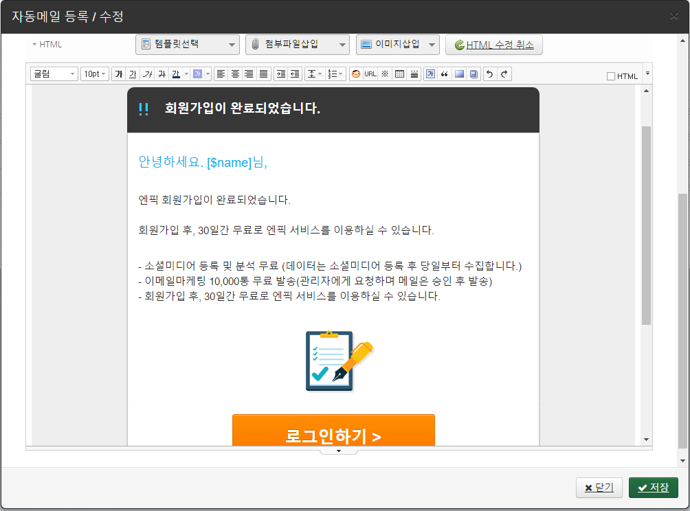자동메일 작성시 메일 내용을 확인하기가 어렵습니다. 에디터 기능을 제공하여 작성한 메일 내용을 바로 확인할 수 있습니다. 또한, 일대일 치환하는 정보를 확인하고 삽입할 수 있습니다.