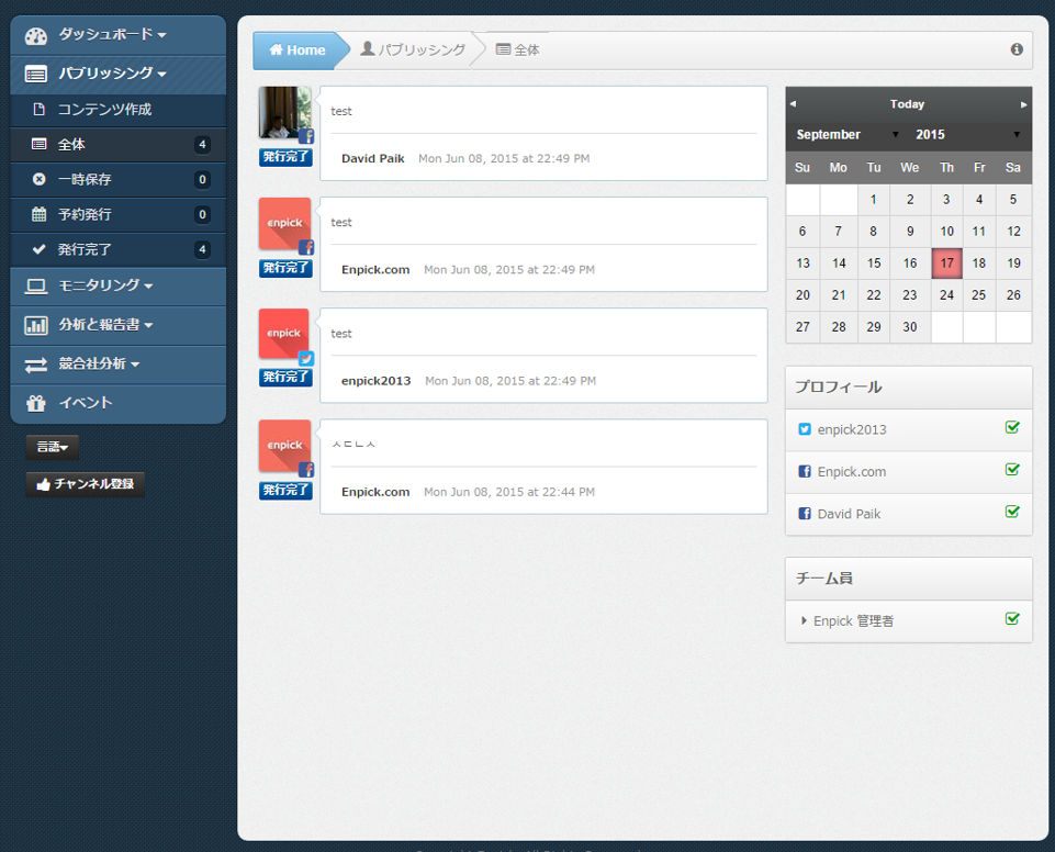 コンテンツ作成後、すぐに発行。発行完了をクリックすると、当該コンテンツは選択したFacebookとTwitterに同時発行。